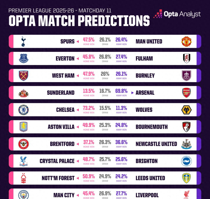 如果按照以往Opta的胜平负预测中,当平局概率超过25%而比赛平局的结果、其可能性就会增加的情形来看,第11轮的英超或许将会呈现的就是至少半数比赛出现平局的可能性。