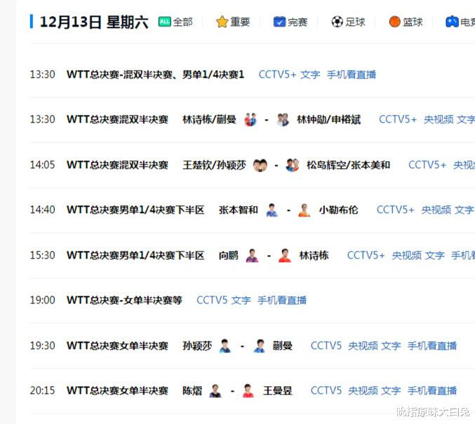 WTT香港总决赛来到了第二个比赛日,最精彩的时刻到来,12月13日的赛程一起来看看。国乒混双冲冠,单打3场内战,蒯曼陈熠崛起,国乒提前包揽了女单冠亚军。CCTV5+频道在13:30开始直播,CCTV5在19:30开始直播。