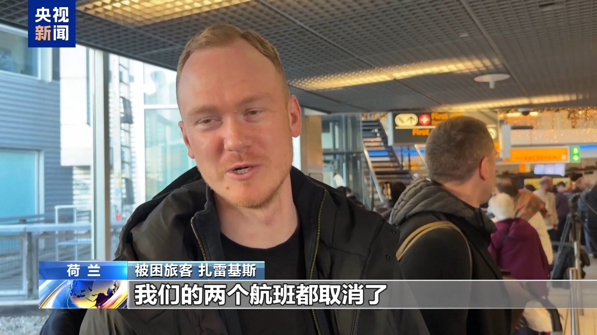 被困旅客 扎雷基斯:我们的两个航班都取消了。我们是立陶宛出发到里加,再从里加到阿姆斯特丹。昨天(5日)我们本来要去拉斯维加斯,但航班也取消了。